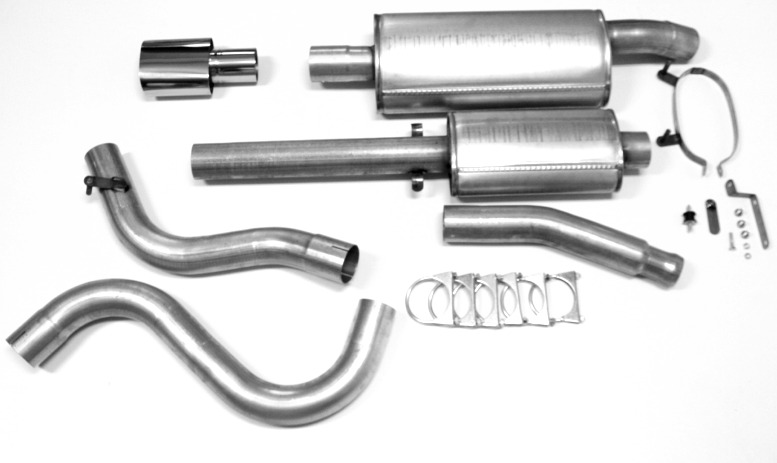 Details: 3" (76 mm) exhaust system manufactured from 1,5-2 mm double side aluminized steel. Sound level according to ISO R362: 78 dbA (+2 db). Back pressure reduction: 50% (appr. 600 Pascal). Stainless matt polished tail pipe.