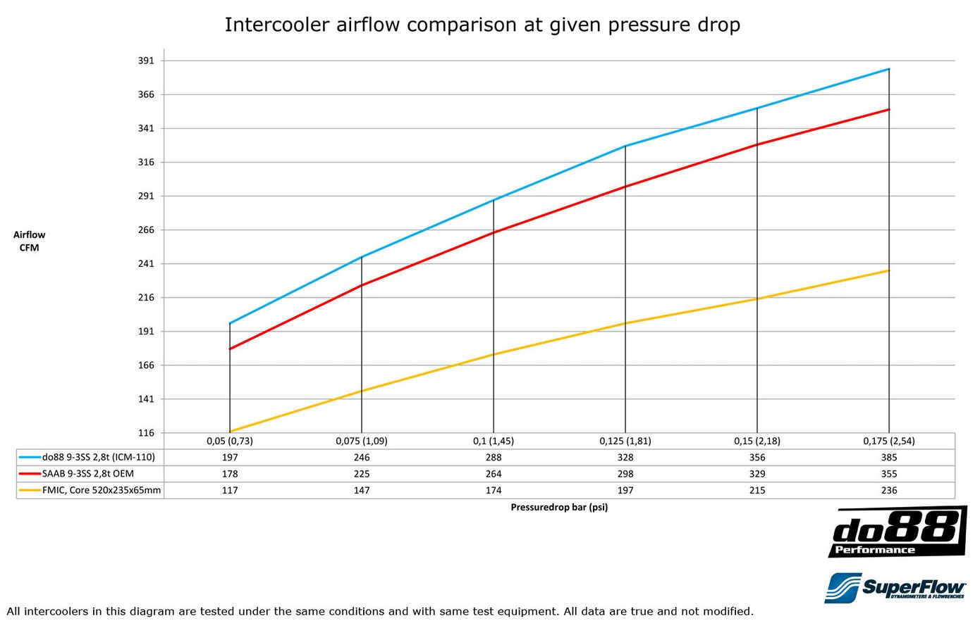 - 8% faster air flow at 0,15 bar / 2,18 psi pressure drop: do88 356 CFM vs OEM 329 CFM, see diagram in the galery
