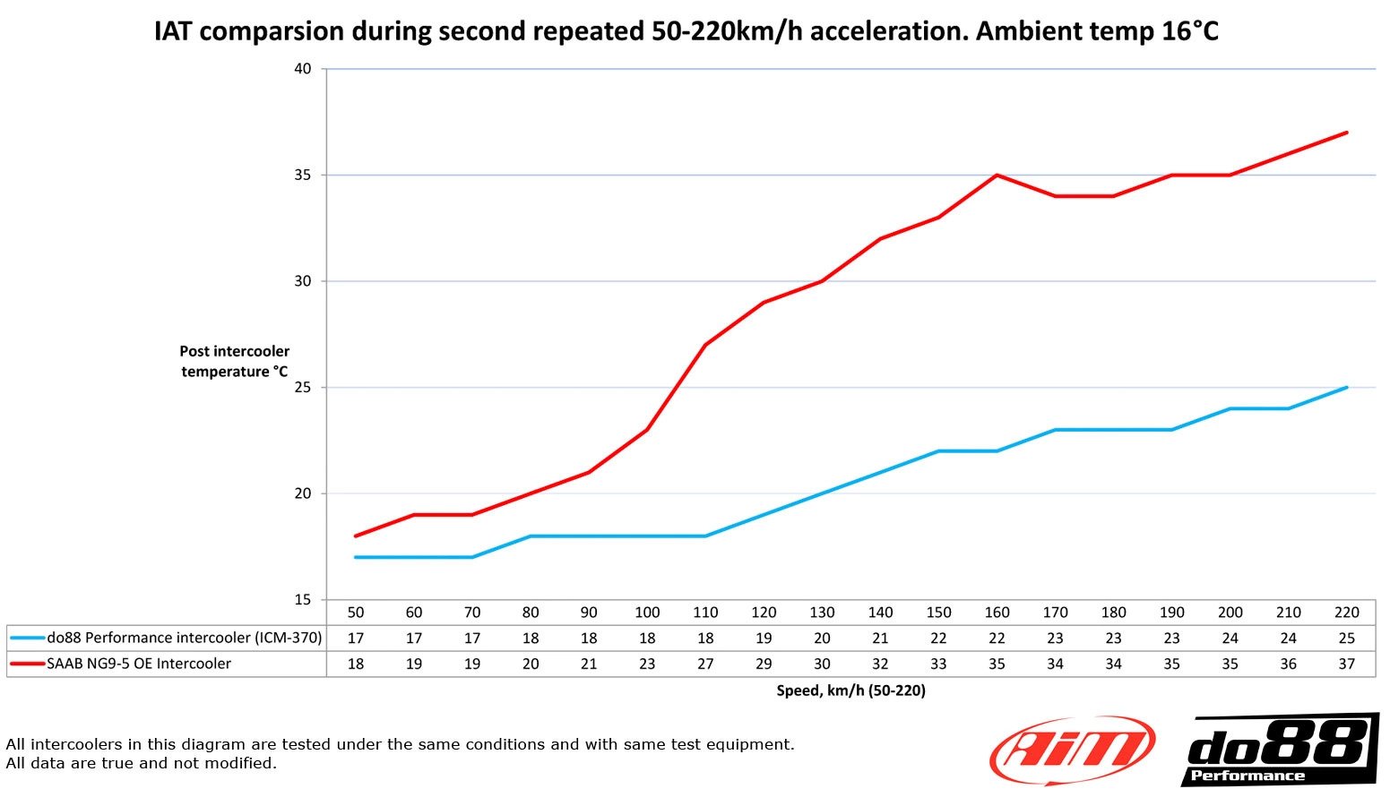 This diagram shows the charge air temperature post do88 performance intercooler compared to OEM intercooler: