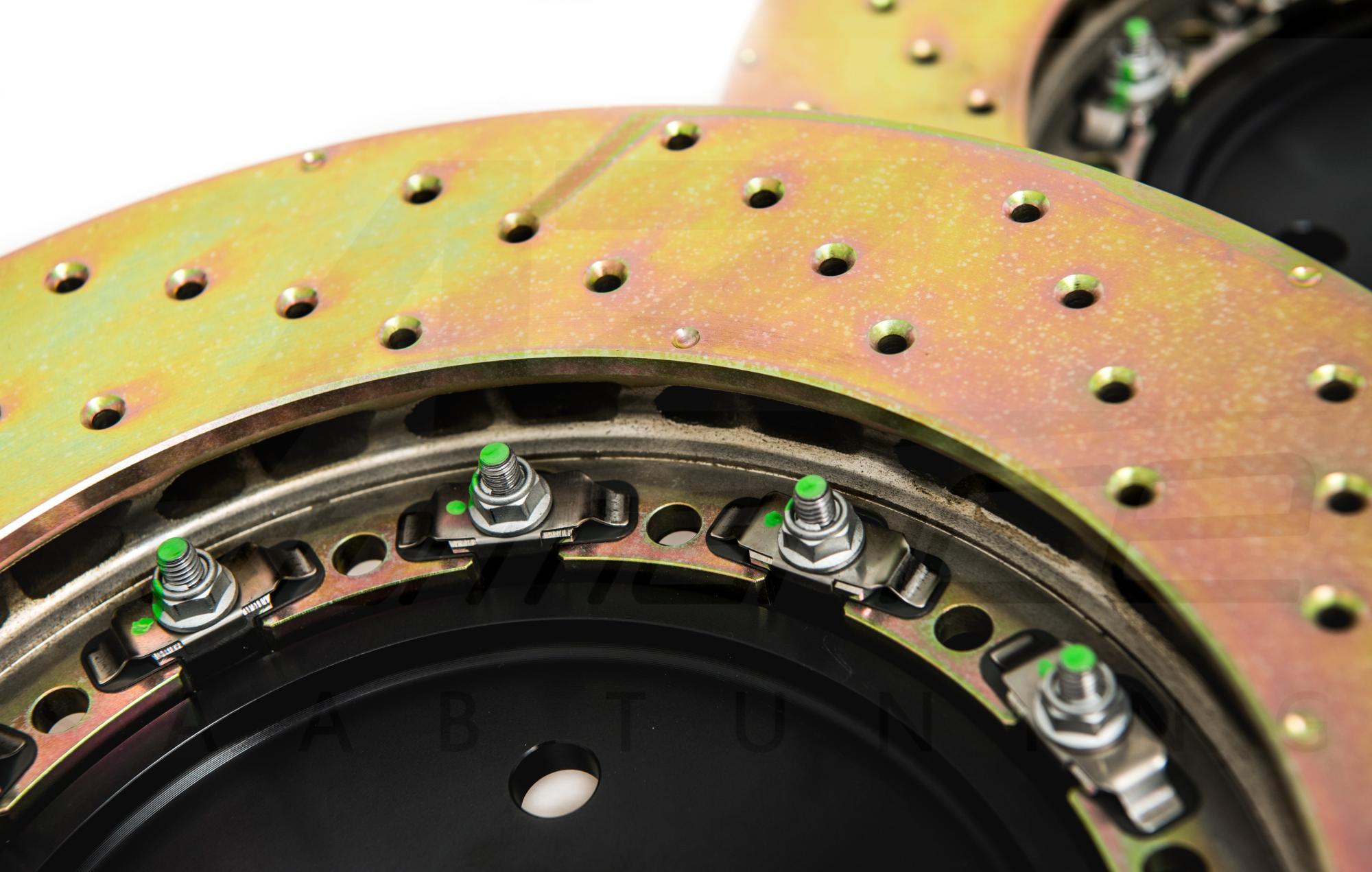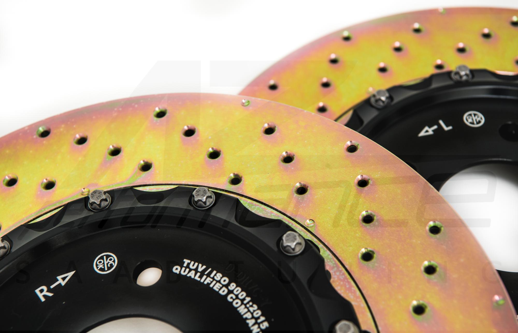 Discs come with two-piece design and center bell is made of aluminum to lower unsprung weight. The design of arc vents provide a better function of heat dissipation and lower the discs temperature in a short moment.