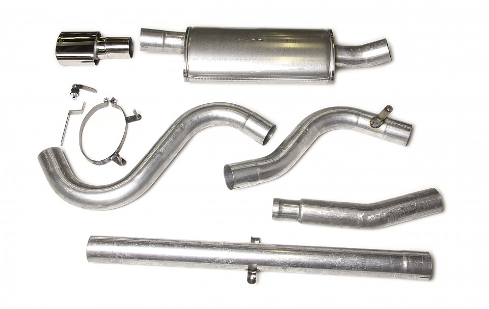 Details: 3" (76 mm) exhaust system manufactured from 1,5-2 mm double side aluminized steel. Back pressure reduction: 50% (appr. 600 Pascal). Stainless matt polished tail pipe.